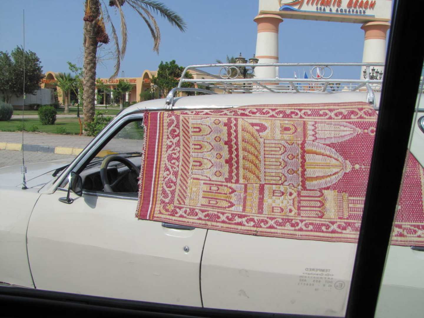wartende Taxis vor dem Hotel mit offenen Fenstern (Klima) und Sonnenschutz (Teppich)