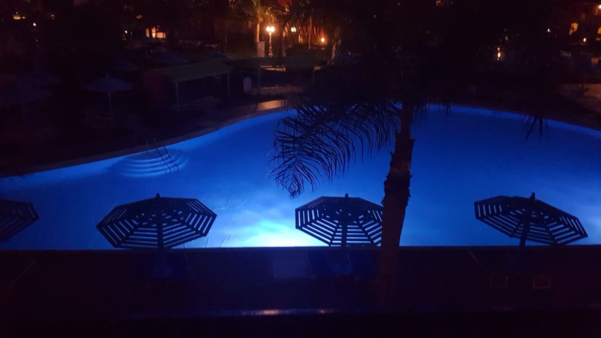 Vom Balkon auf Pool Titanic Beach bei Nacht
