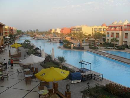 Oben von der Terrasse fotografiertHier hat man eine tolle Aussicht über Pool und Restaurants (linke Seite) sowie auch Ausblick auf die Poolbar.