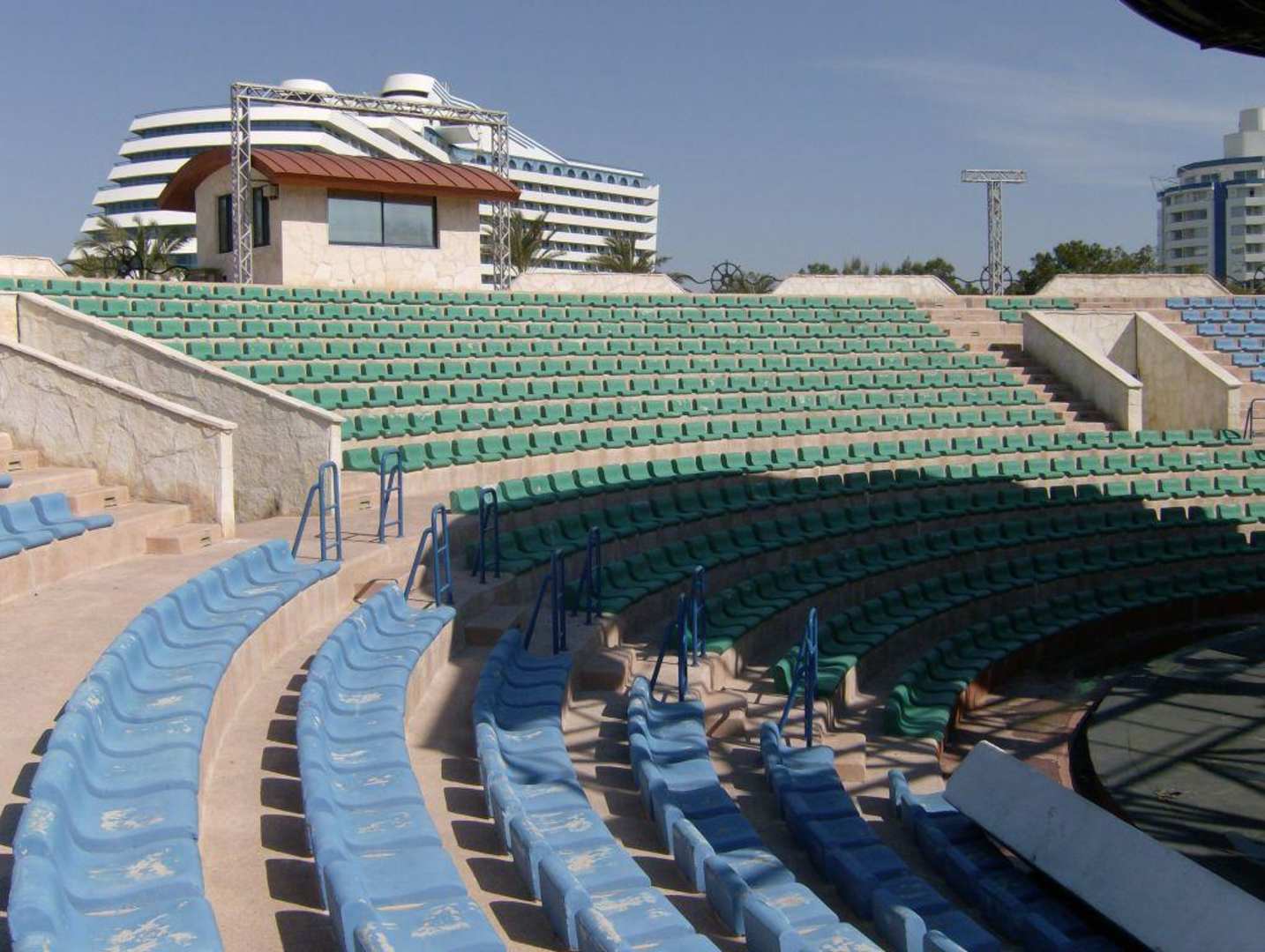 Das ralativ grosse Amphitheater bietet Raum für viele Animationen; im Hintergrund das Hotel, das, wegen seiner Grösse, nur schwer ganzheitlich zu fotografieren ist.