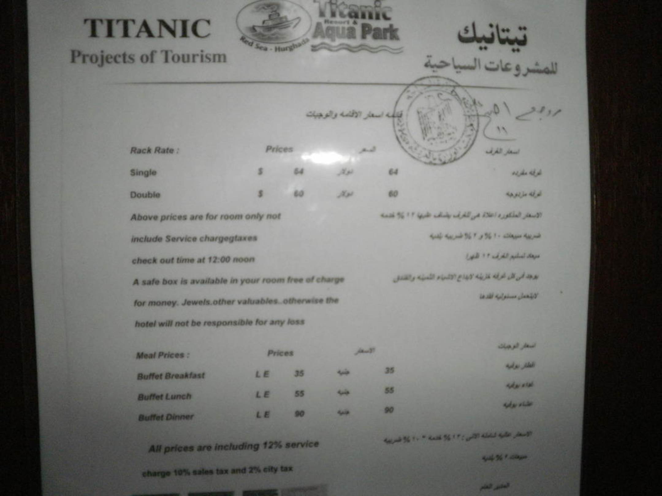 Preisliste des Hotels im Zimmer