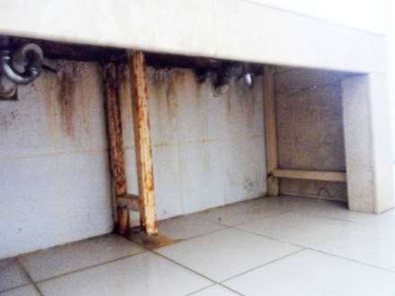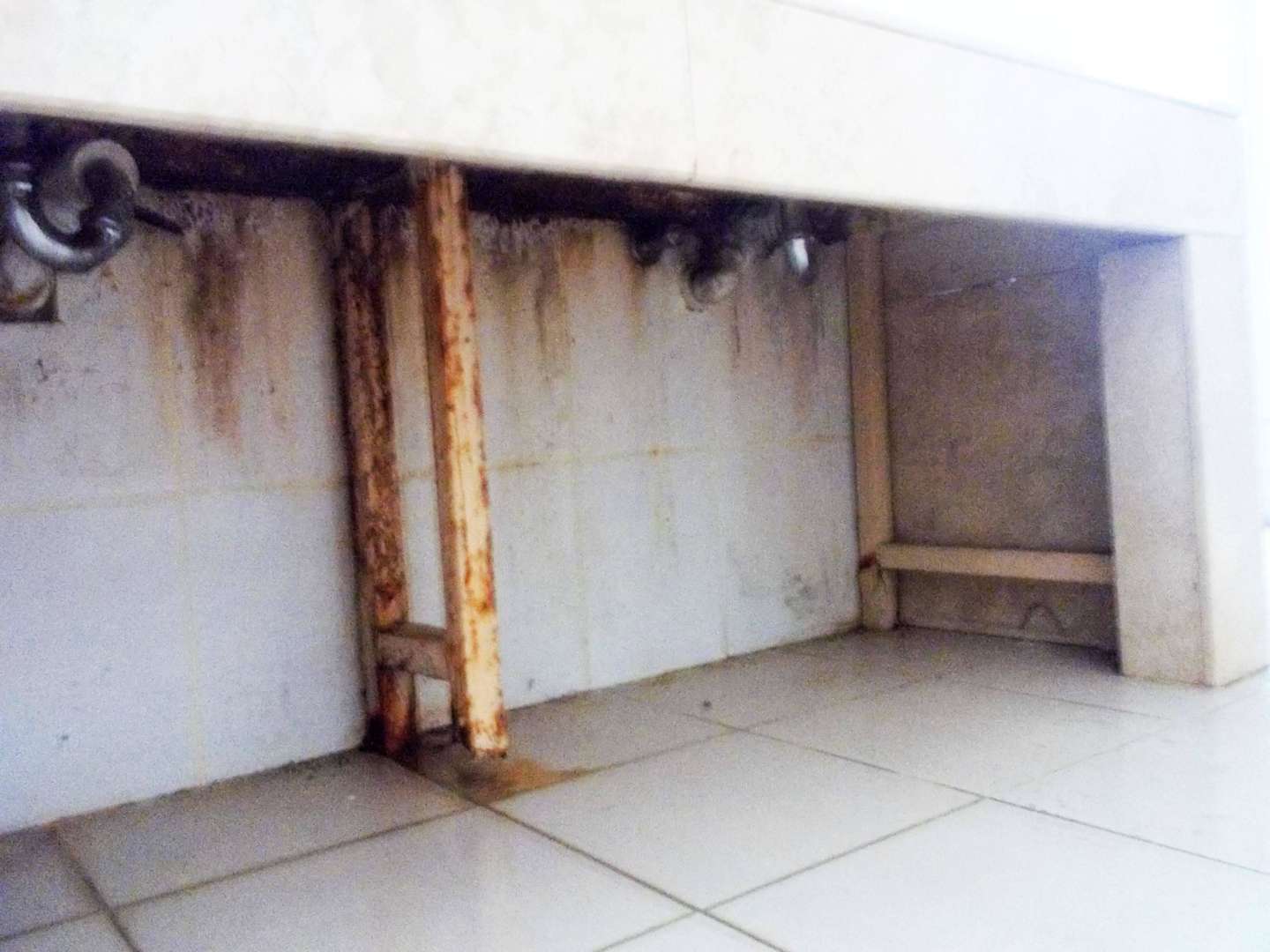 Veraltete Pooldusche /Toilette. So sieht es unter den Handwaschbecken aus.