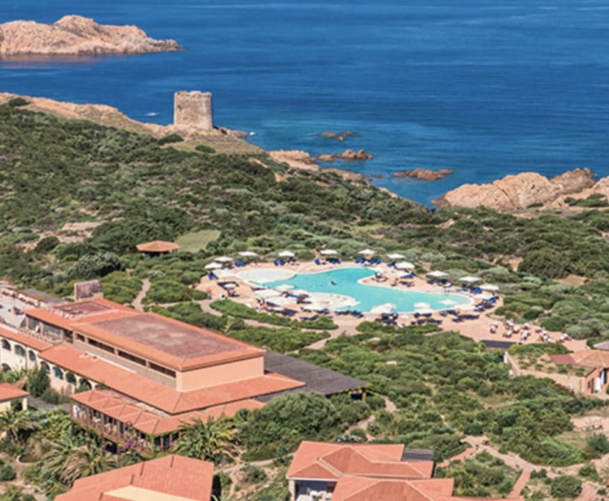 Blick von oben auf die Anlage mit Pool
