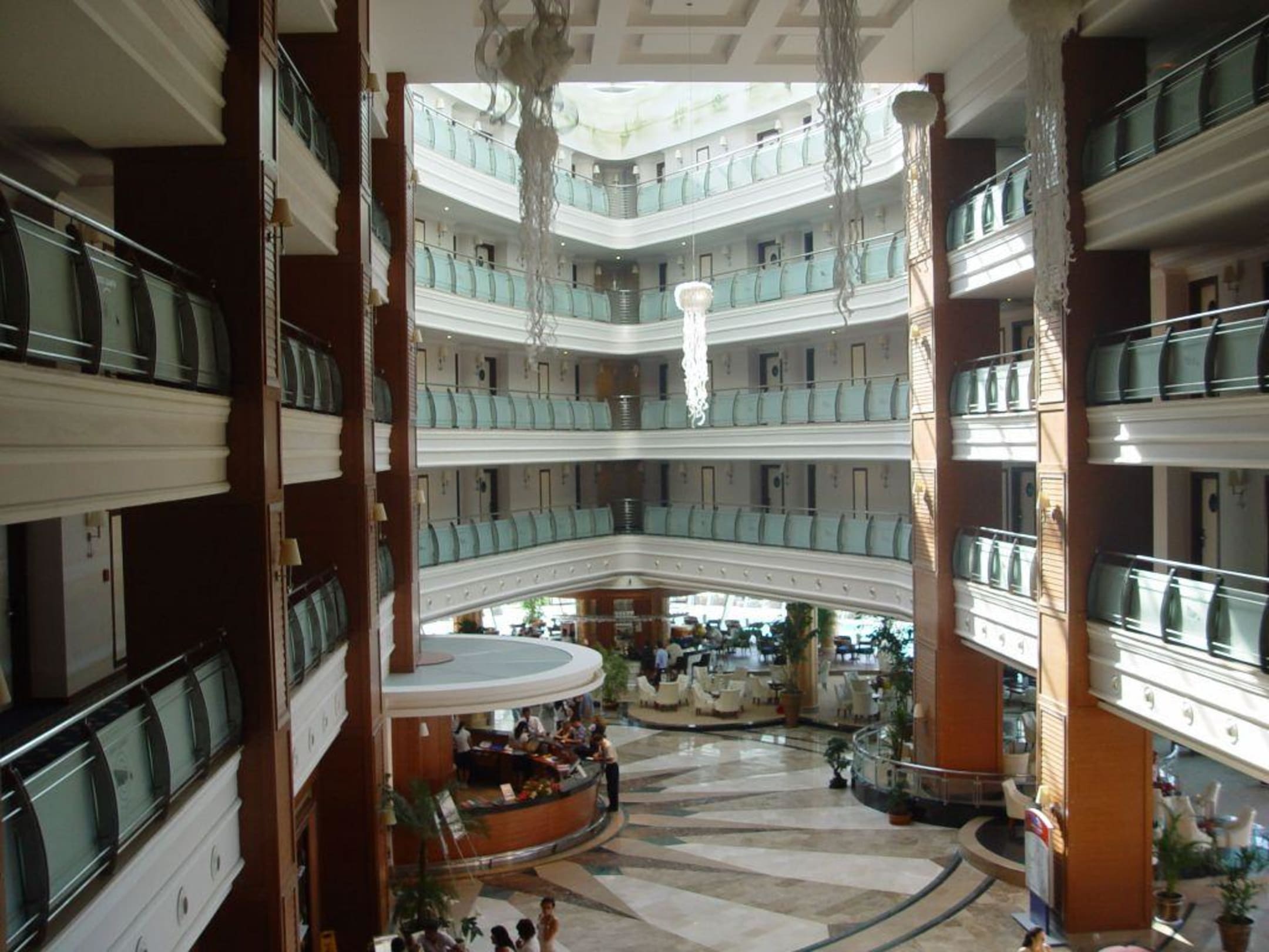 Queen Elizabeth Innenansicht mit RezeptionAn den Seiten befinden sich die Zimmer. Das Bild zurde aus den Panoramaaufzuegen aufgenommen.