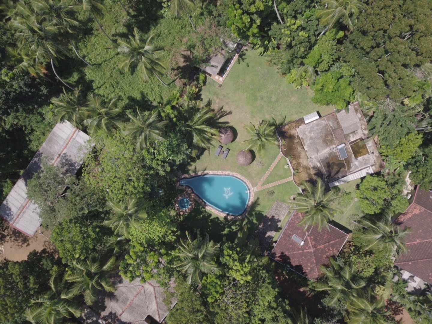 Das gesamte Areal der Traumvilla von oben: ganz links Ayurveda-Bereich, Mitte unten das Restaurant, oben rechts der Doppelbungalow, darunter der Einzelbungalow, ganz rechts ein Teil der Suite und des Haupthauses