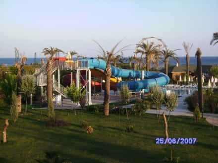 dies sind die großen Rutschen. Im Hintergrund das Risenrad des Nachbararhotels Turan Prince