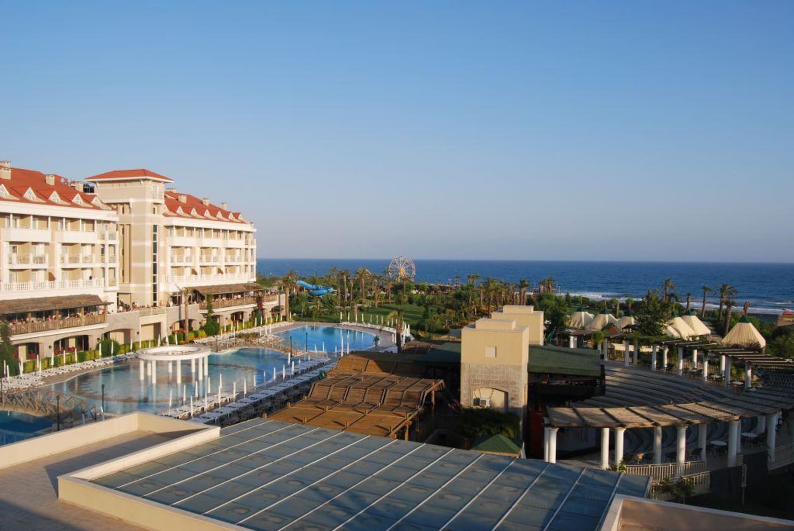 Blick vom 2. Stock im Block 3 auf Pool, Arena, Garten und Meer