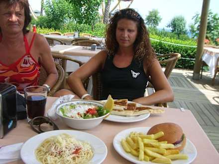 Essen im StrandrestaurantWirklich lecker. Es gab Hamburger, Cheeseburger, Pizza, Fladenbrot versch.belegt, Salat, Spaghetti, Hähnchen, versch.kleine Desserts.