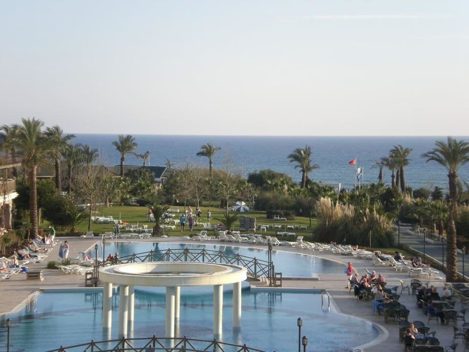 Blick von oben auf die Poolanlage mit Strand