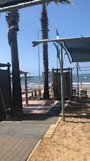StrandBlick von der Strandliege auf den Duschbereich und das Meer