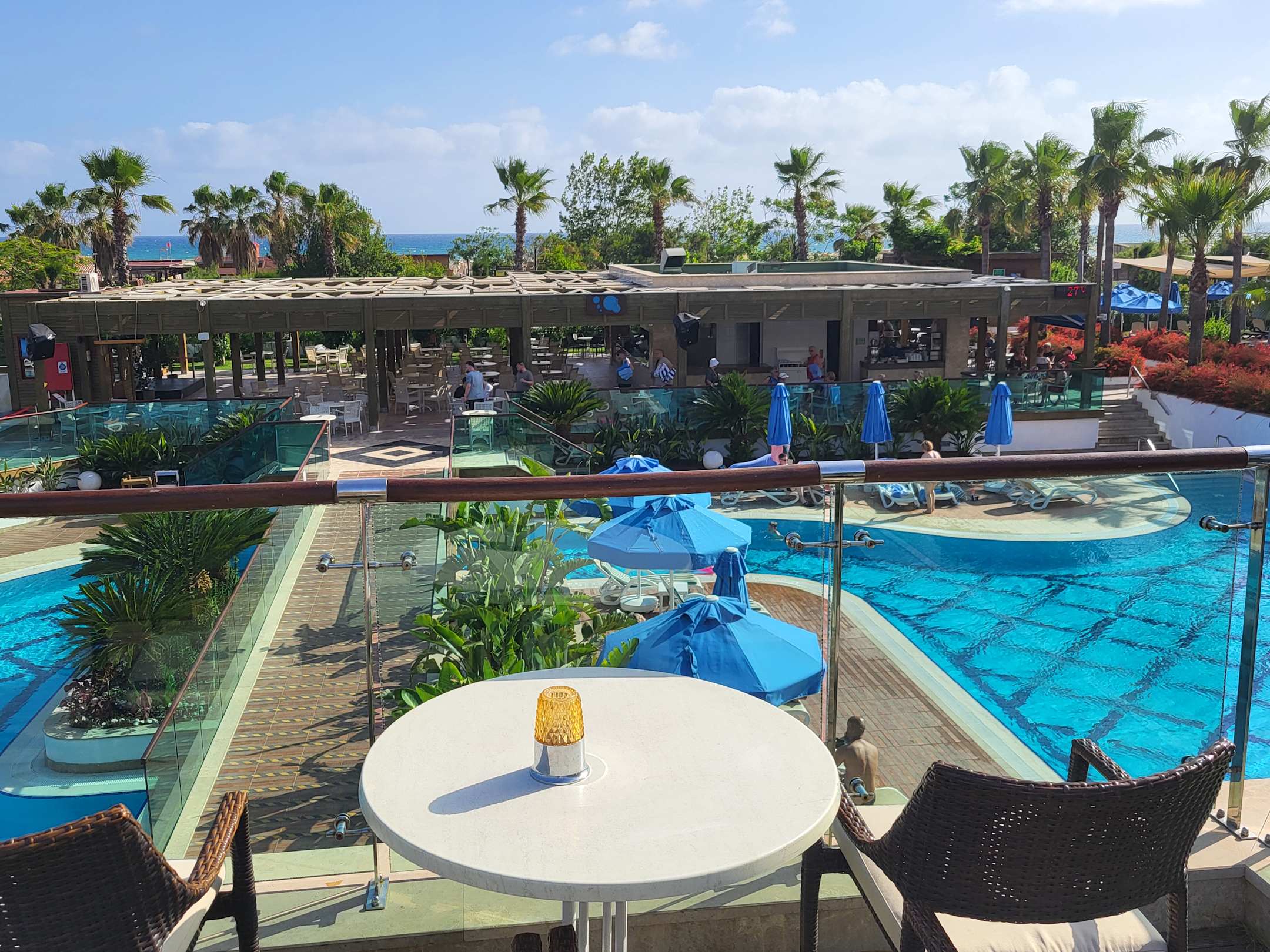 Sonnenterasse mit Blick auf den Pools, Poolbar und Meer.