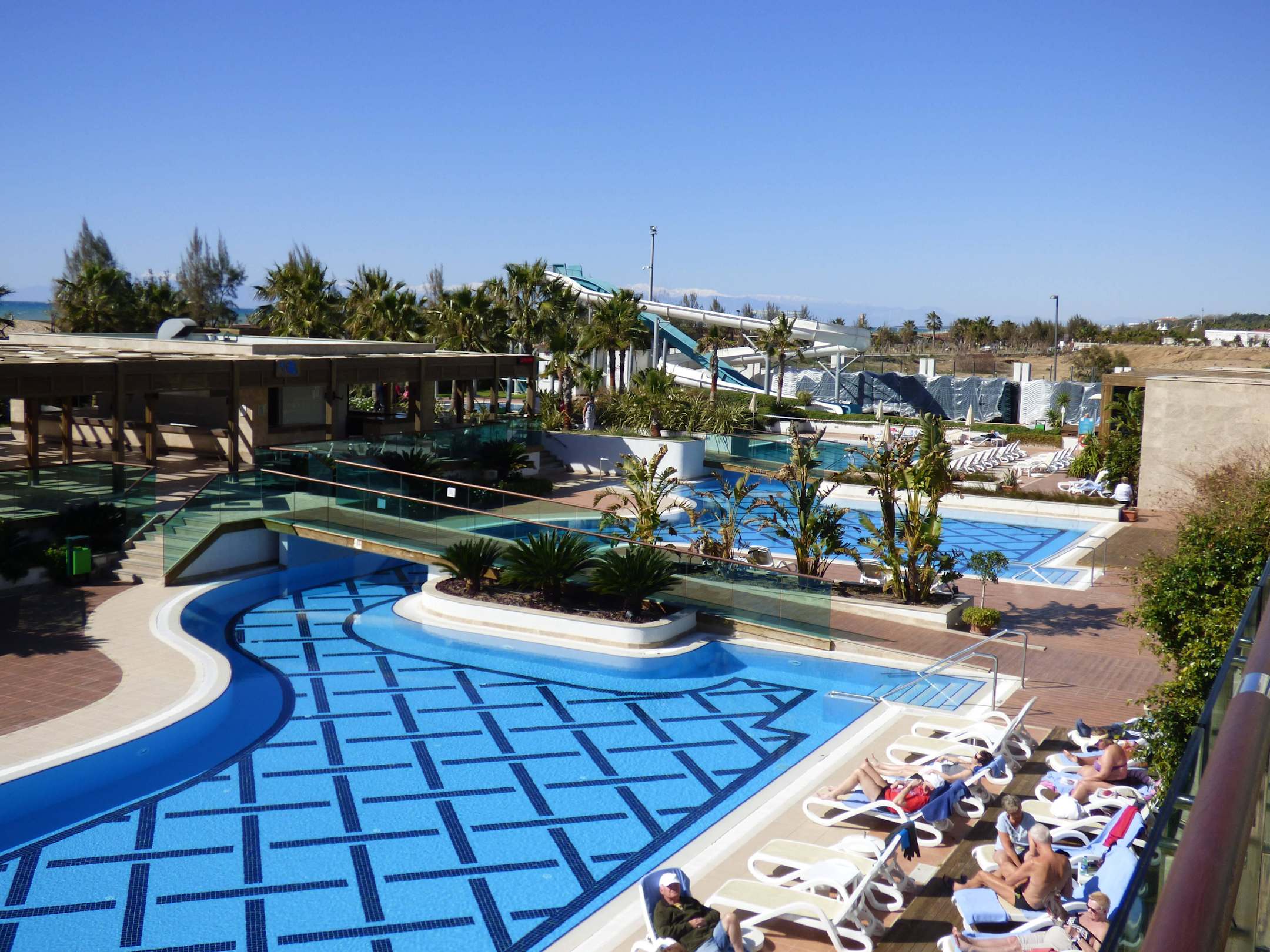 Blick von der Dachterrasse auf die Poolanlage