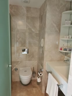 WC mit Waschbecken, Schminkspiegel und Fön.