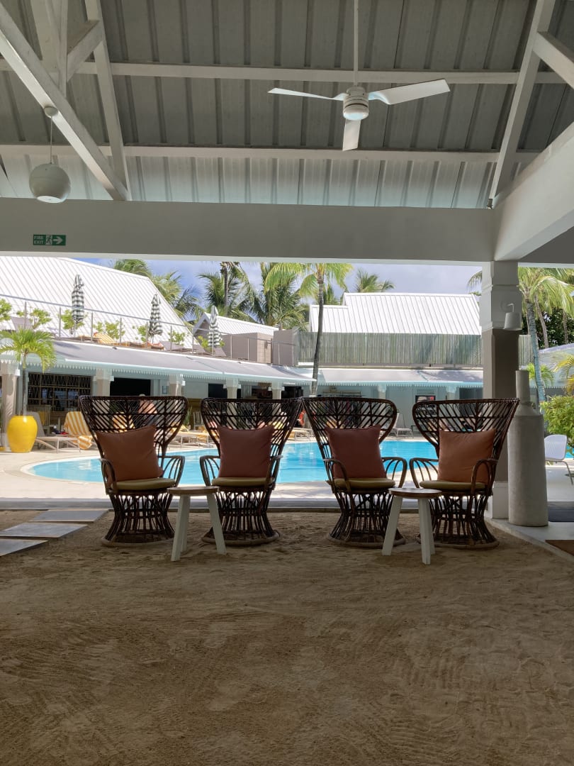 Blick von der Lobby über Pool und Liegen auf der Dachterrasse.