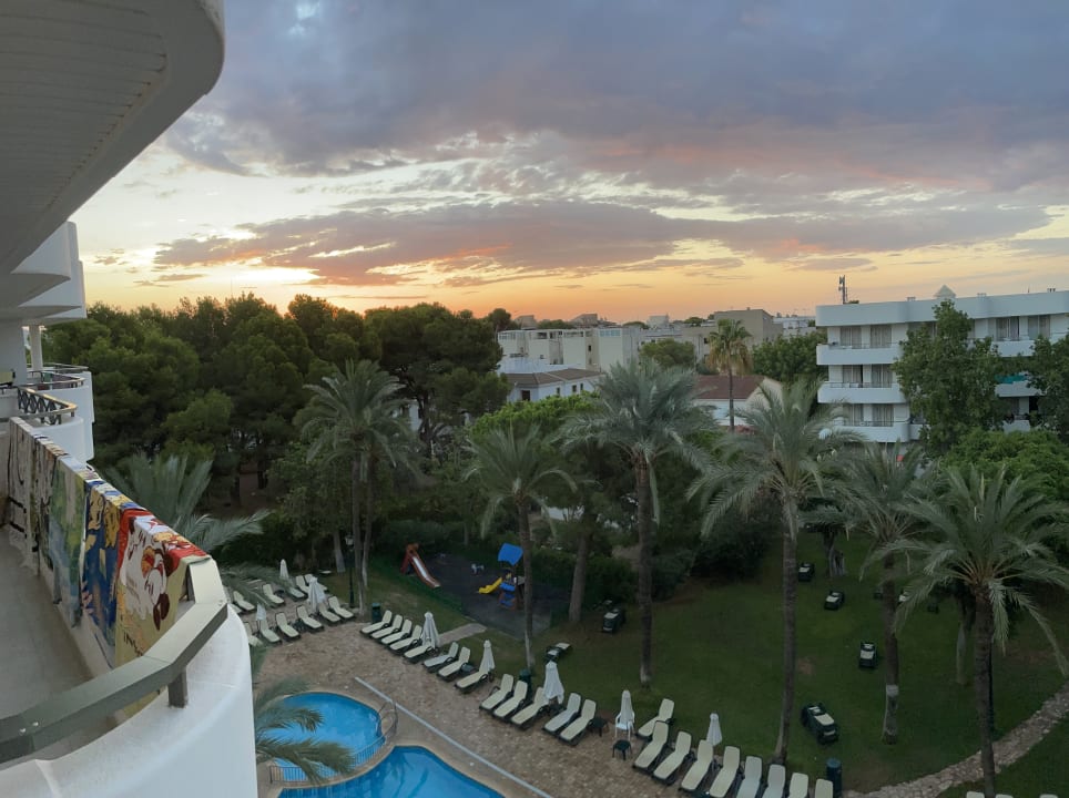 Blick vom Balkon in Richtung Meer auf Pool und Gartenanlage