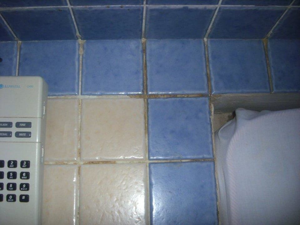 Dreck und Schimmel gleich am BettGemauerte und geflieste Bettrahmen. Auch hier im "renoviertem" Zimmer Dreck und Schimmel immer in Reichweite...