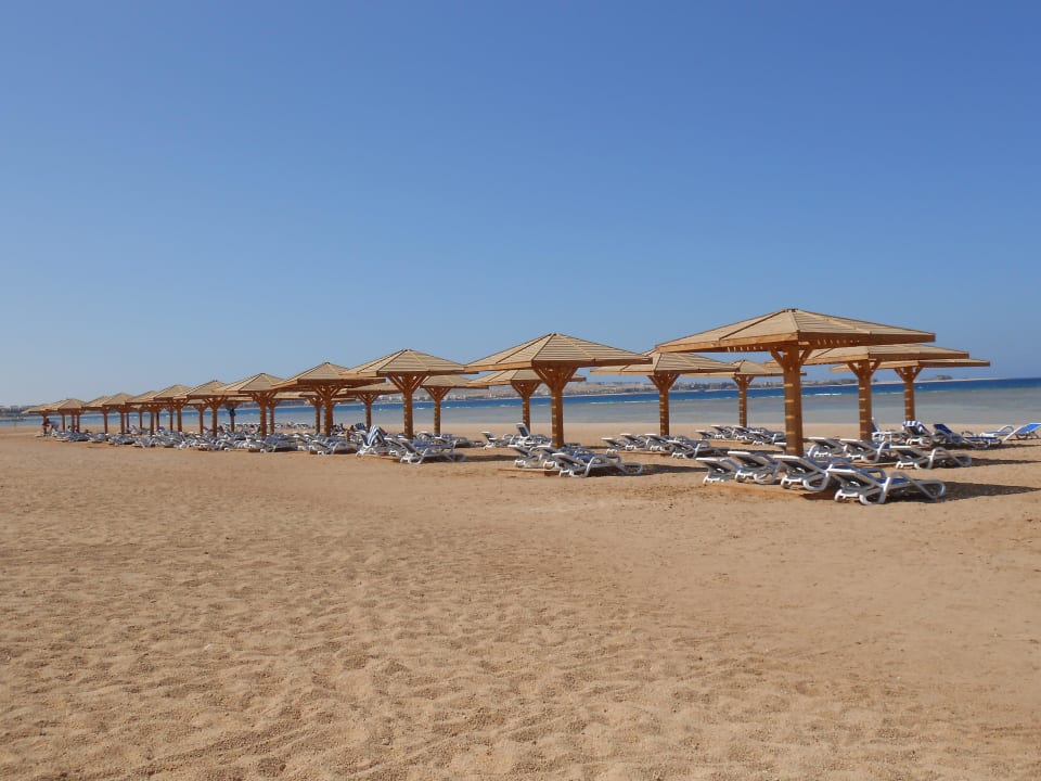 Strand mit Liegen und Sonnenschirmen