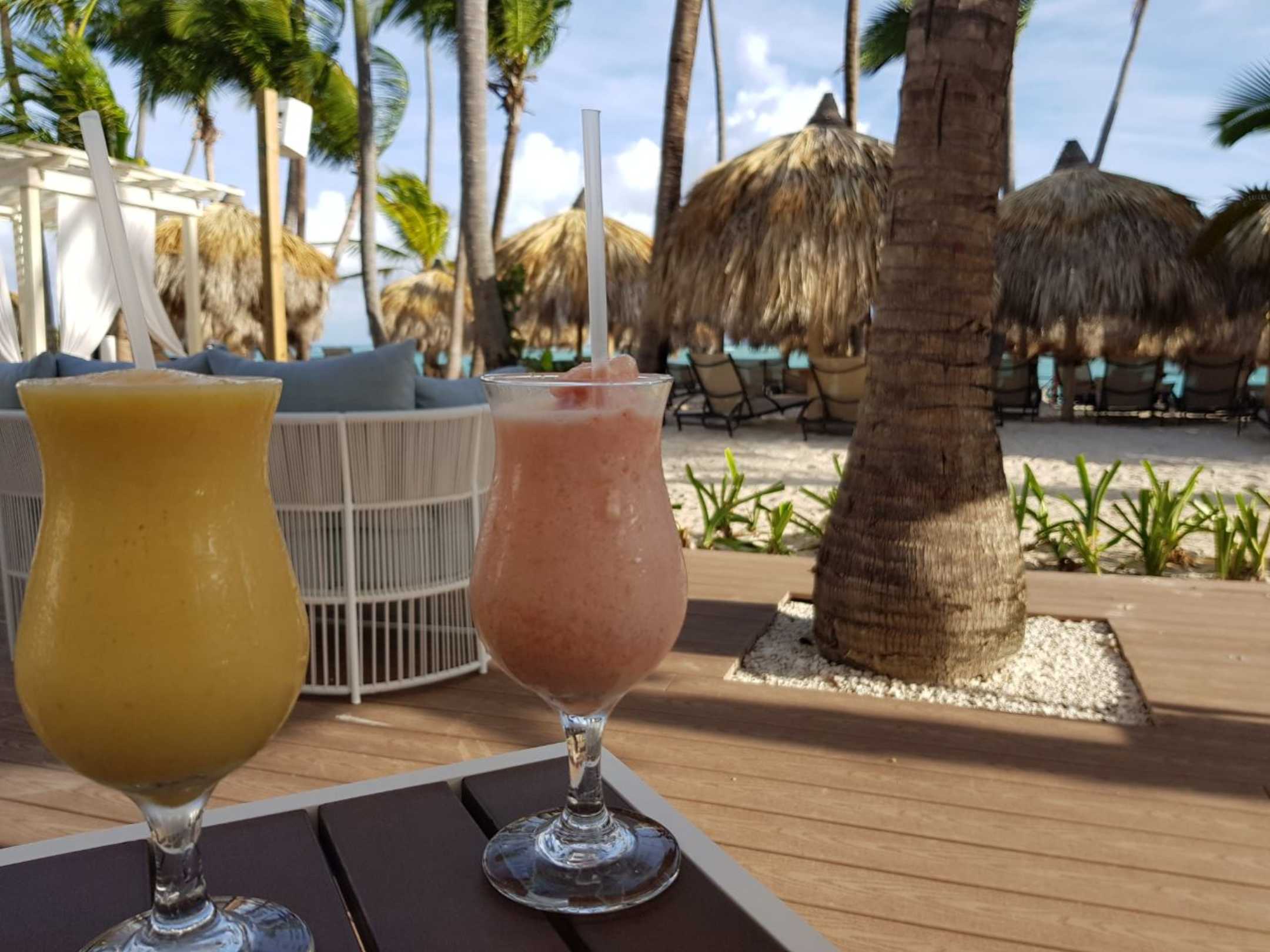 Smoothie zum Frühstück. Blick auf den Strand vom Restaurant Helios.