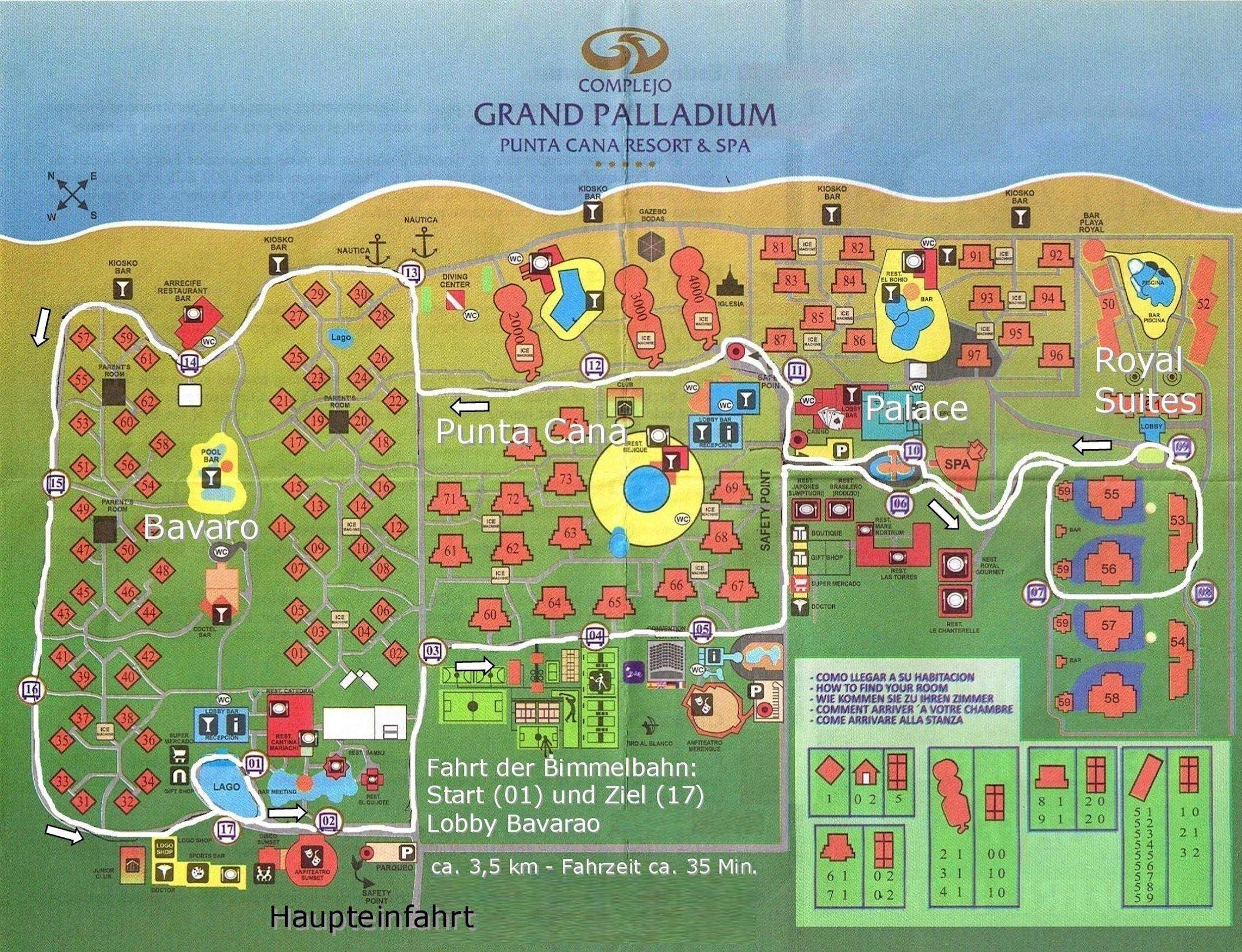 Lageplan Grand PalladiumAlle vier Hotels auf einen Blick. Den Plan gibt's in der Lobby. Die Route der Bimmelbahnen habe ich weiß markiert. Der Strand vom äußersten linken (Bavaro) bis zum äußersten rechten Punkt (Royal) ist rd. 980 m. Der weiteste Weg z. Strand: rd. 500 m.