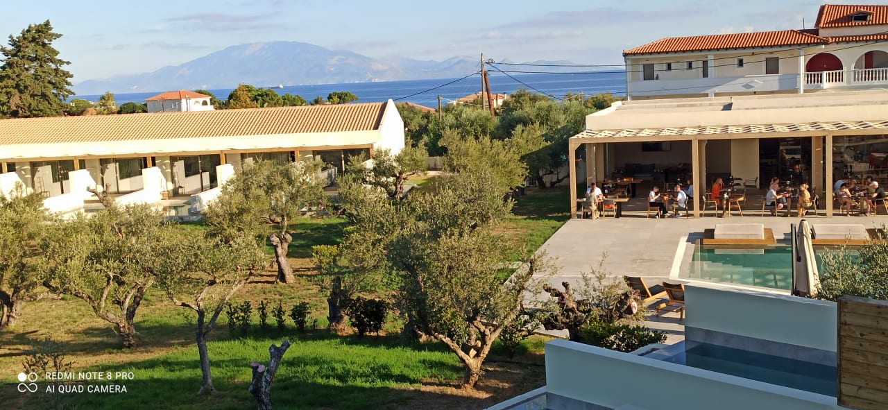 Ausblick von unserem Balkon, man erkennt auch schön die unteren Poolzimmer, den Pool und das Frischluftrestaurant. Der Zimmerkomplex gegenüber gehört auch zum Zsamis Zante Suites