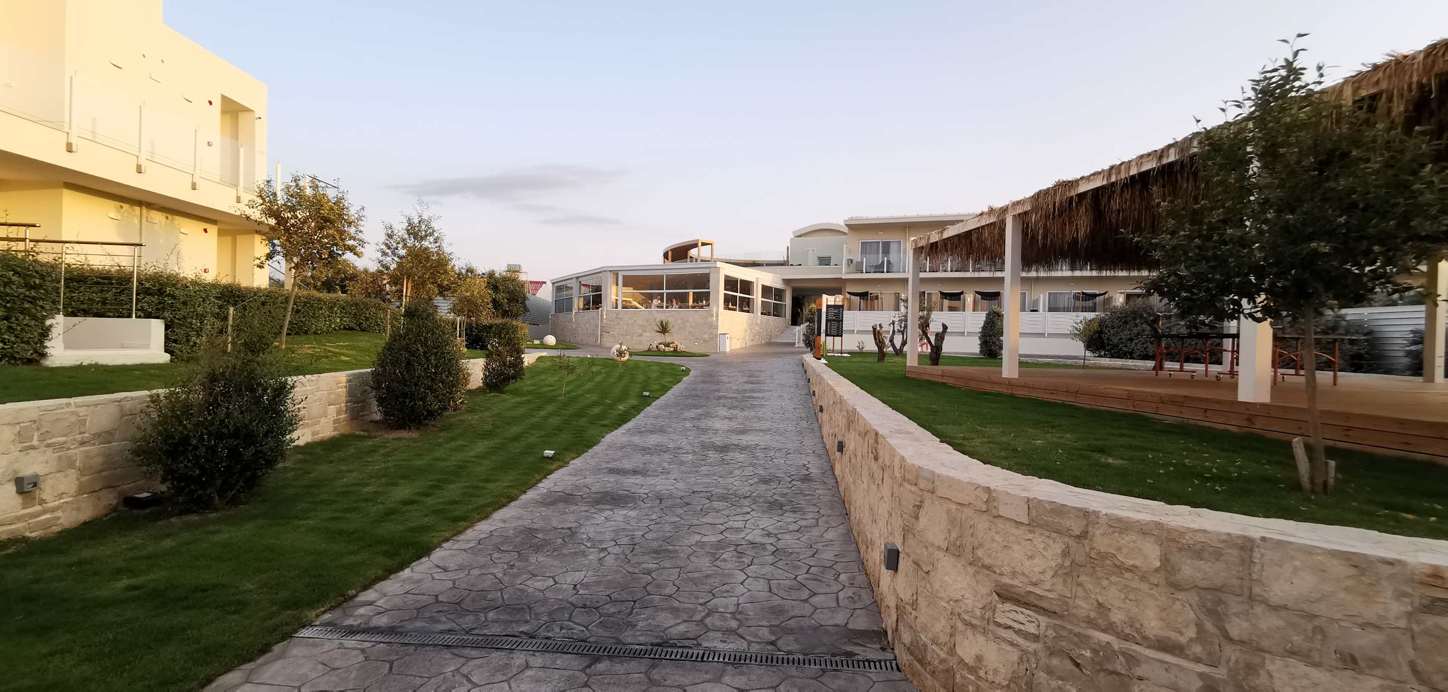 GartenanlageBlick Richtung Hauptrestaurant. Rechts überdachte Tischtennisplatte. Morgens findet dort Fitnessprogramm statt.