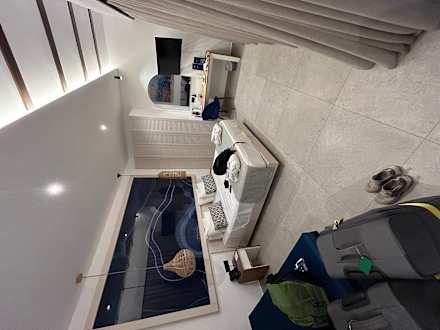 Bett mit Kleiderschrank, Couch und TV vor einem großen Panoramafenster mit Meerblick