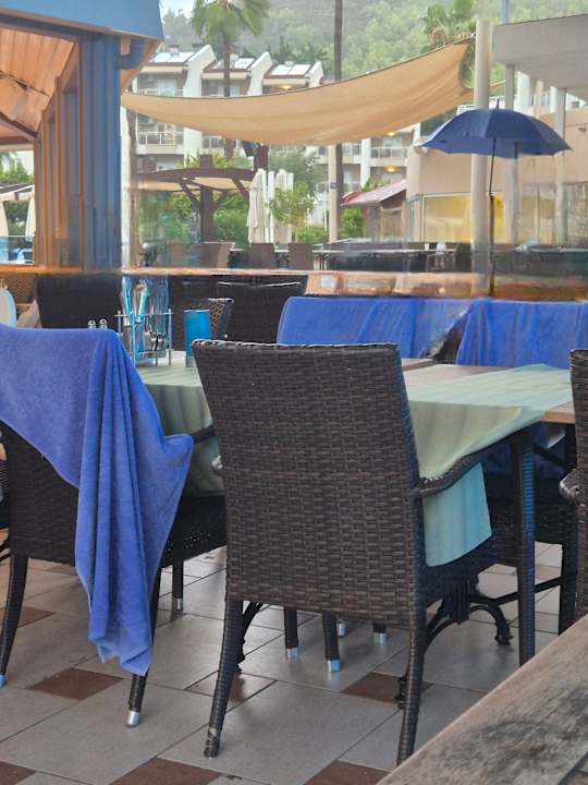 Mit Badetüchern reservierte Tische im Restaurant