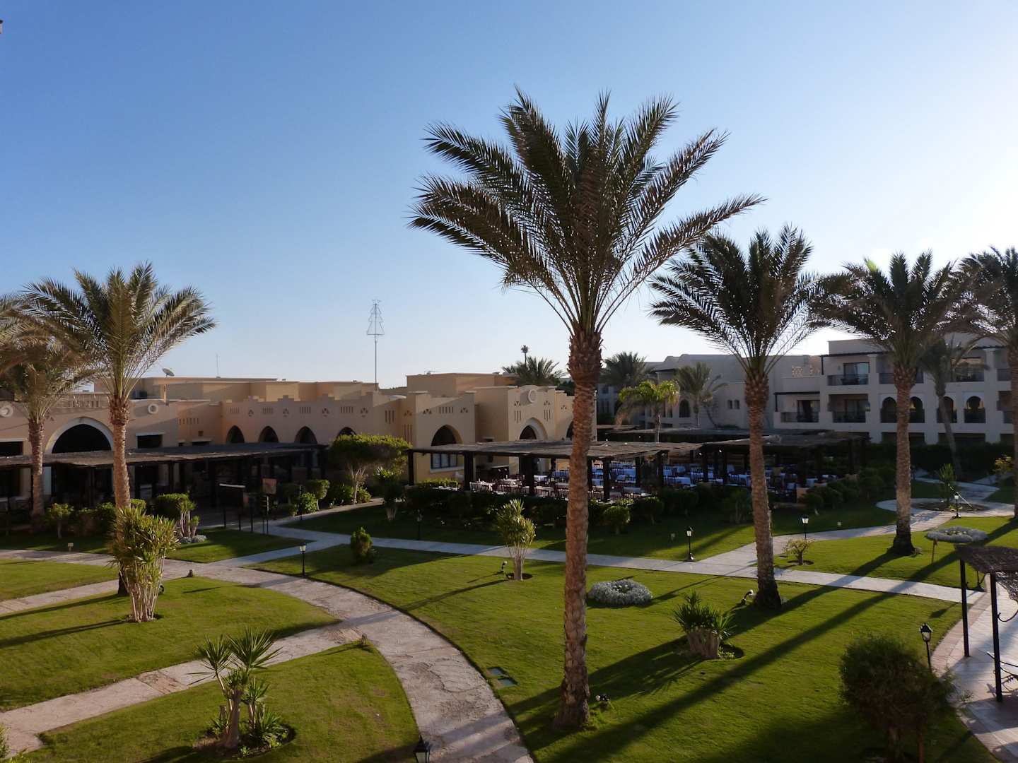 Blick vom Zimmerbalkon auf das Restaurant
