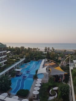 Blick vom Balkon zum Pool und Meer