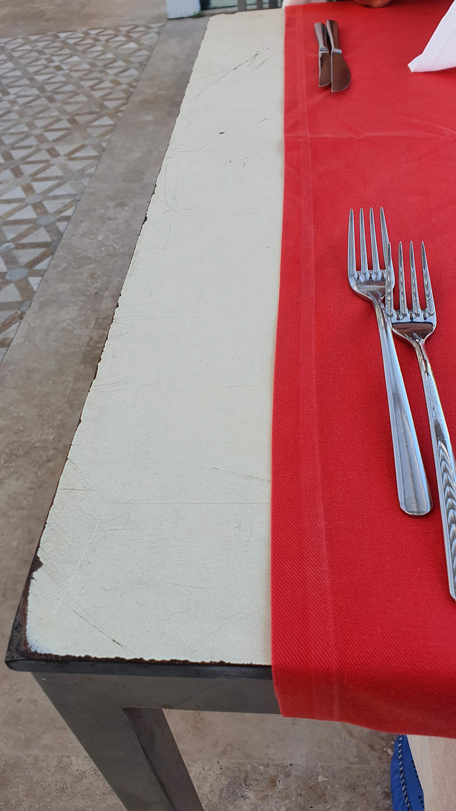 beschädigte Tische ohne Tischdecke am türkischen Abend