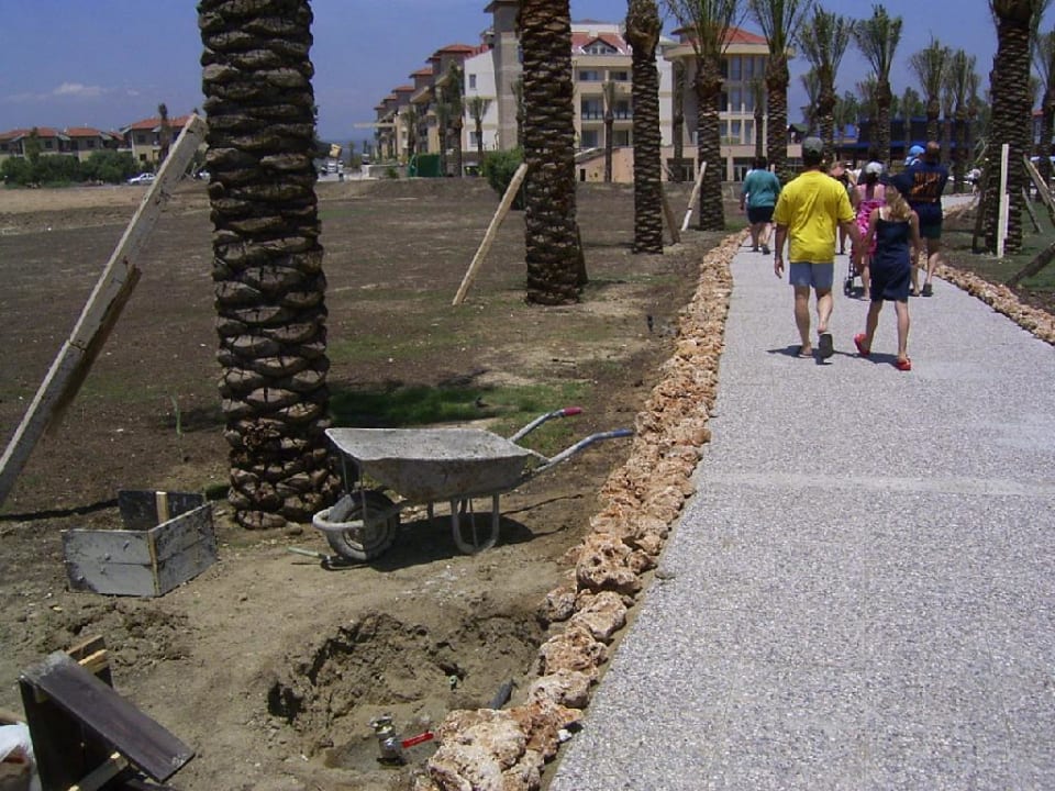 Der Weg zum Strand von Palmen gesäumtdie Stützen kommen sicher bis zum Sommer weg, der Rasen grünt recht schnell bei der Bewässerung...