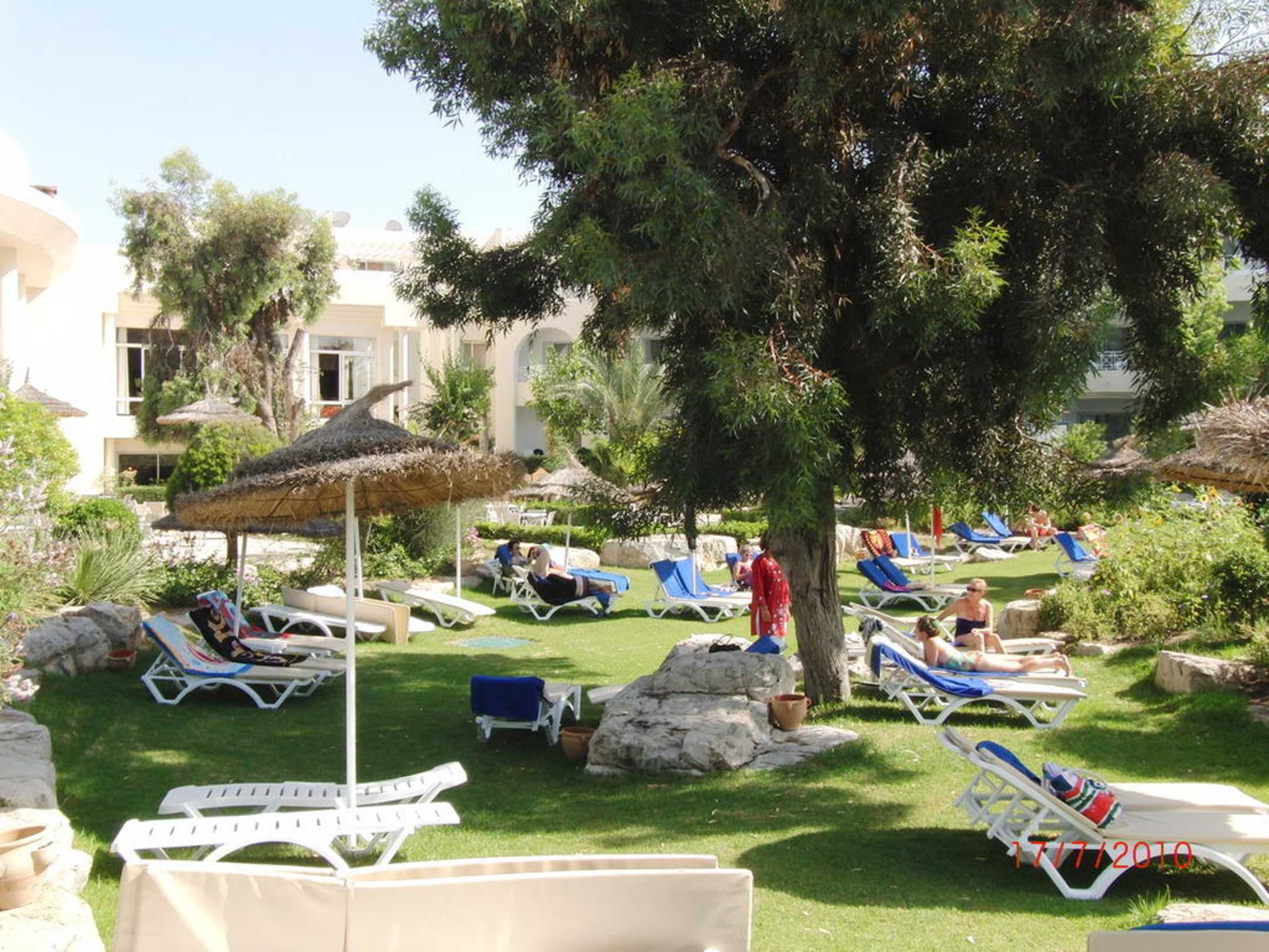 Liegen unter Bäumen und Schirmen auf grüner Wiese