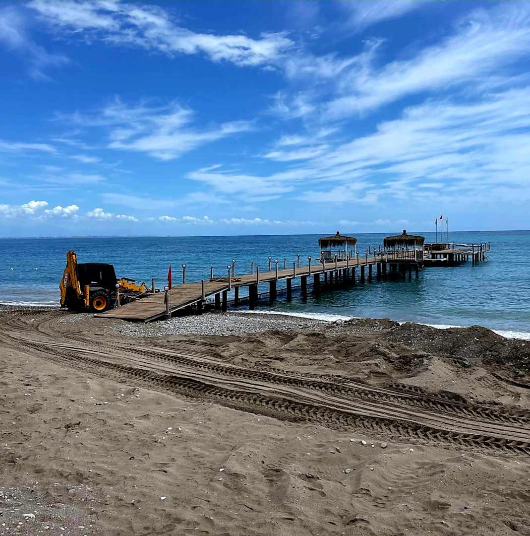 Strand steinig, Baggerarbeiten seit 3 Tagen. LUEGEN OHNE Auflagen.