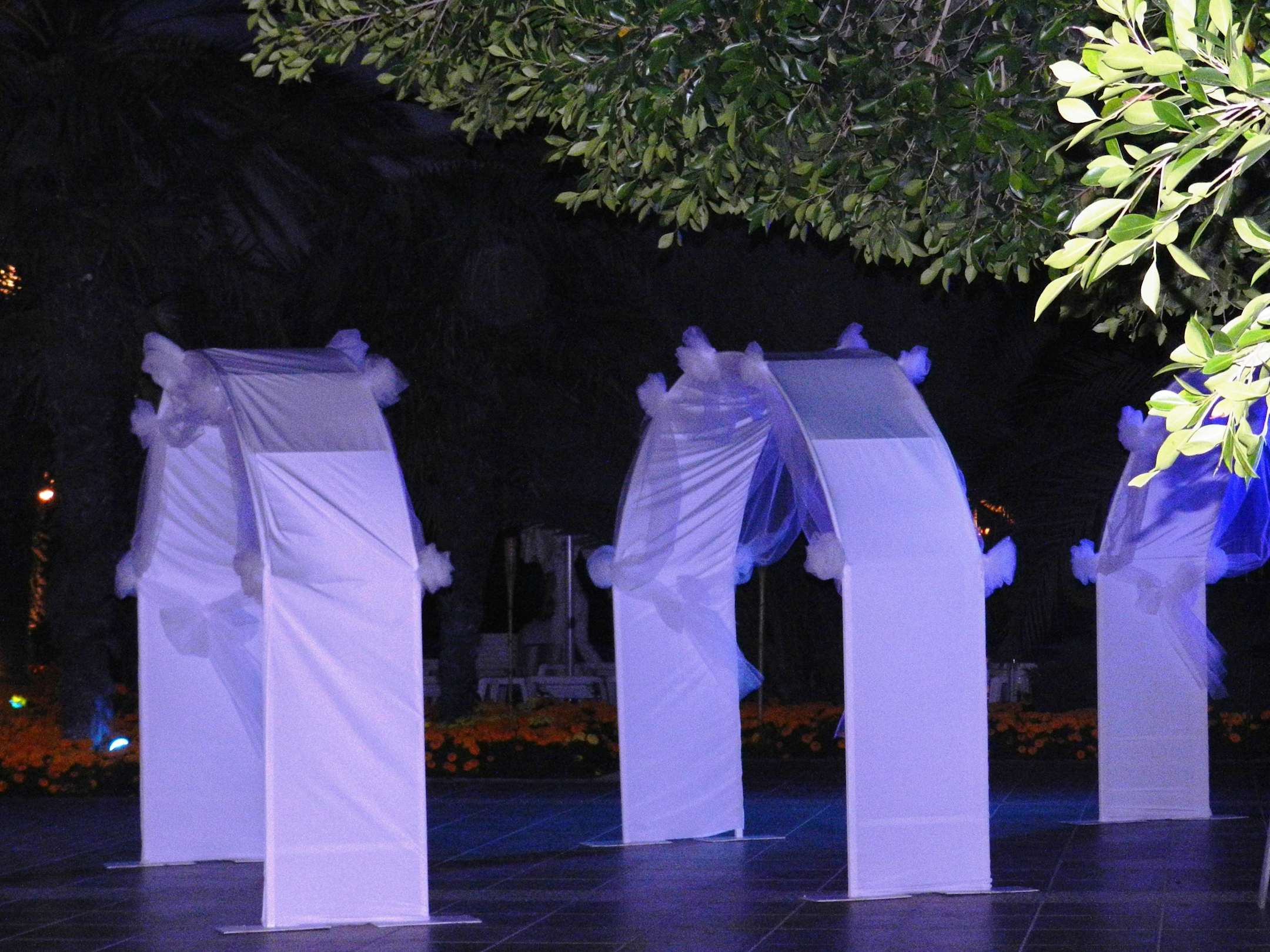 Für die White Party wird schon nachmittags alles liebevoll geschmückt. Hier die mit Schwarzlicht angestrahlten und mit Tüll geschmückten Torbögen, die eine Verbindung zwischen Poolbar und Hauptrestaurant herstellen.