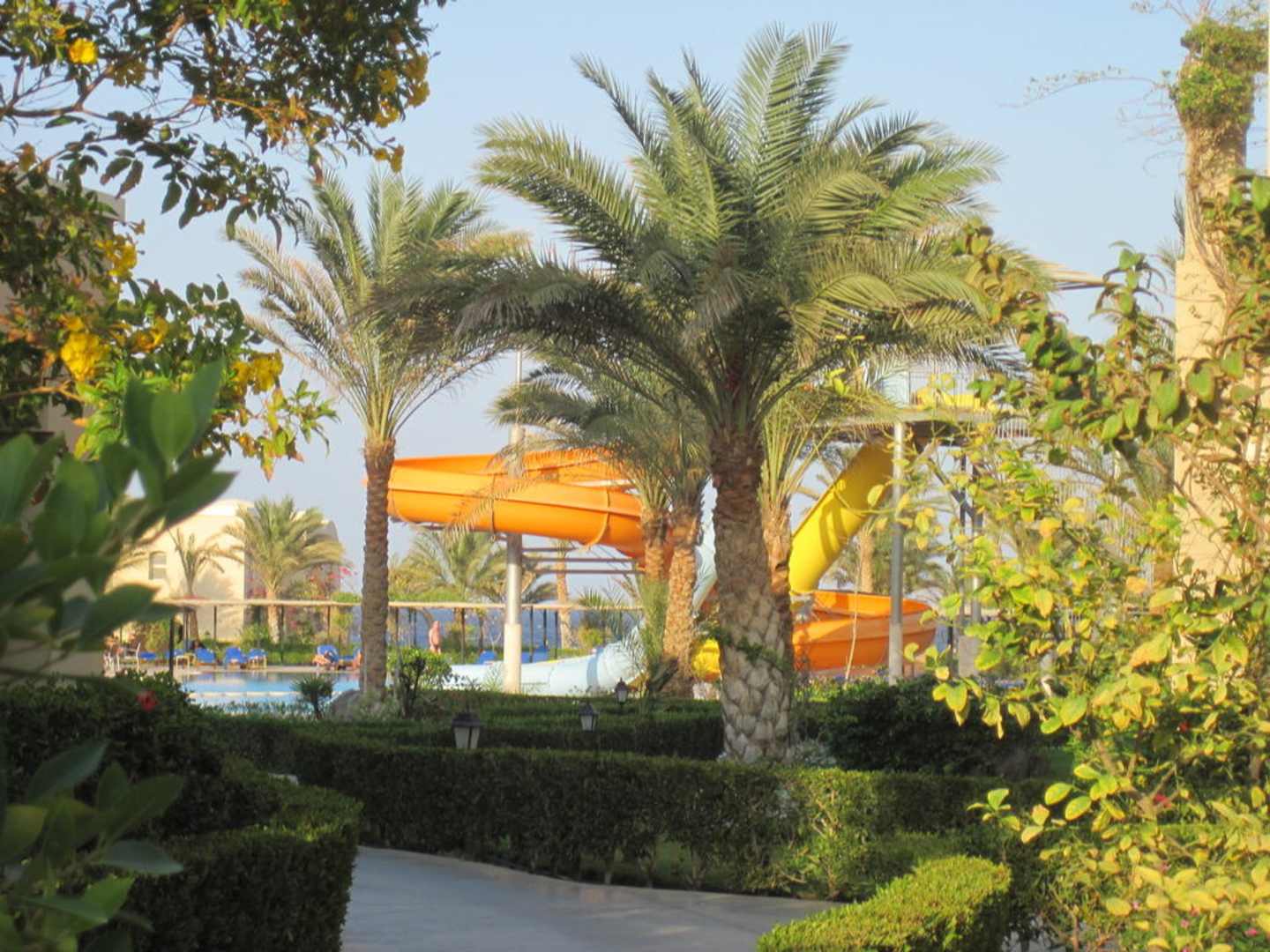 Gartenanlage mit Rutschenpool im Hintergrund