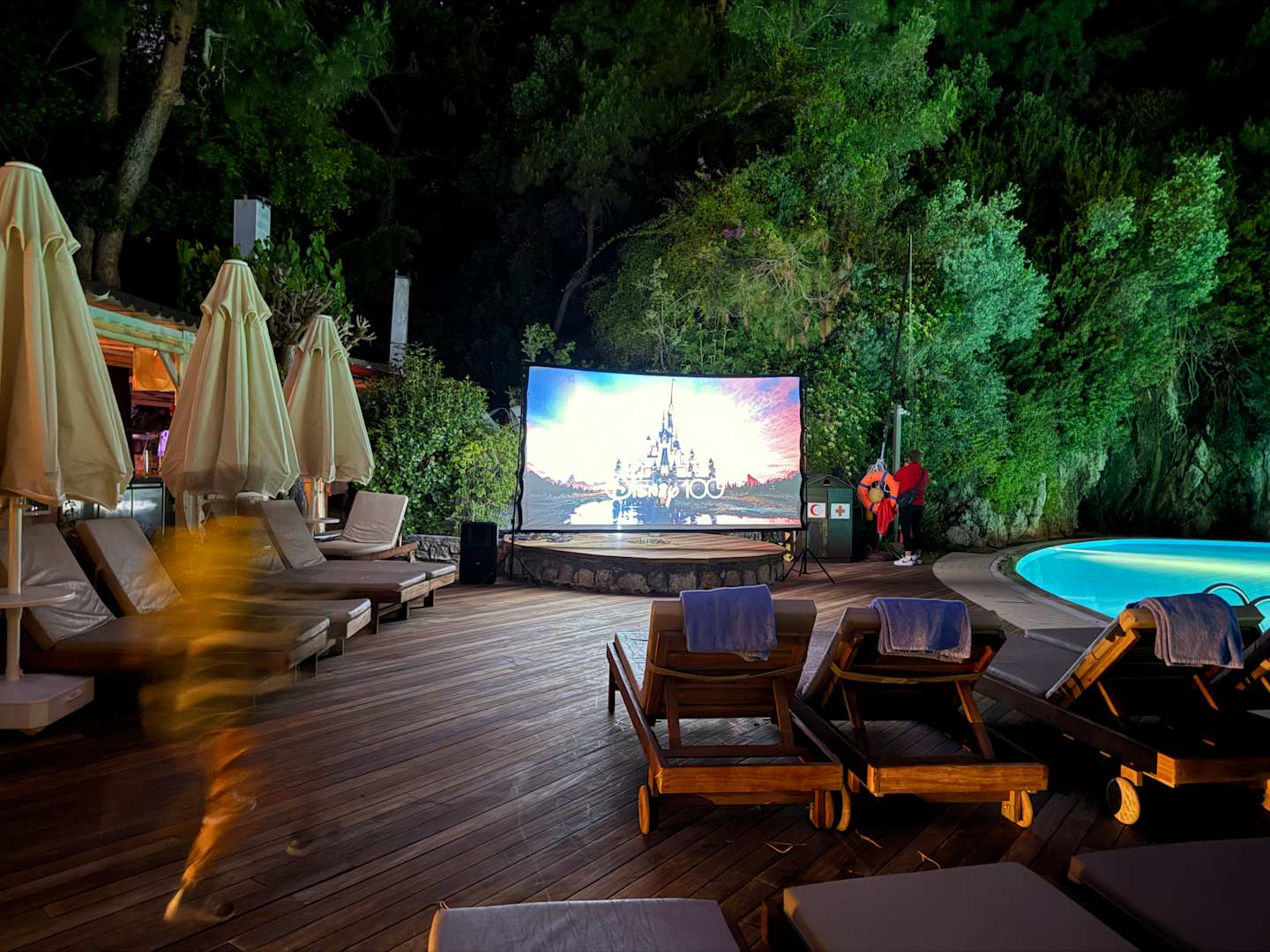 Cinema eigentlich im Pool, bei kühlerem Wetter aber auf den Liegen