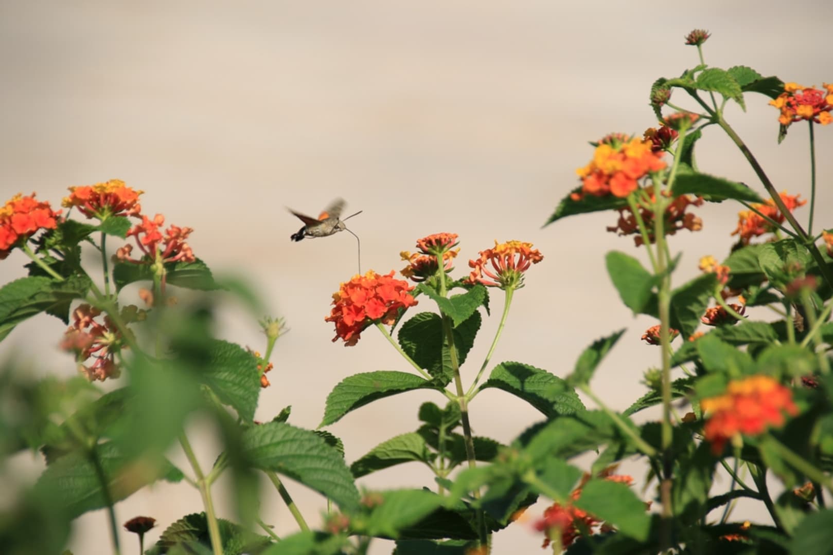 GartenanlageTaubenschwänzchen (Macroglossum stellatarum) an Wandelröschen (Lantana camara) im Hotel.