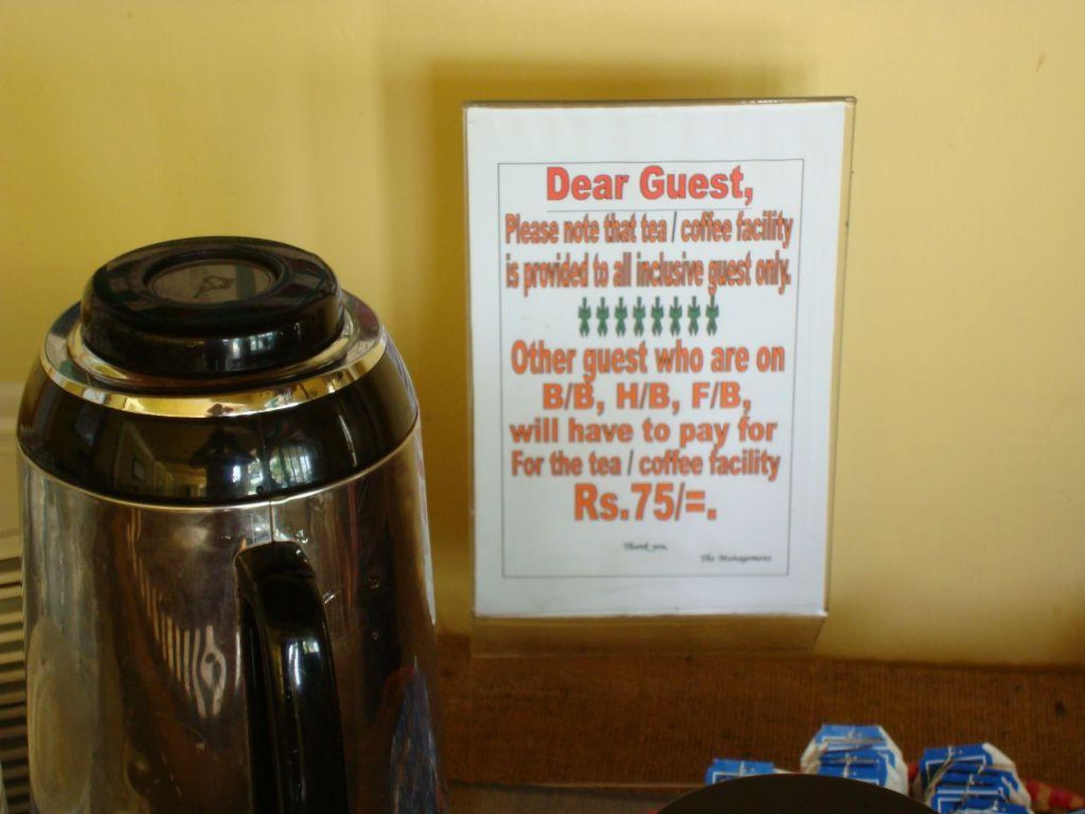 Dodatkowe opłatyTa tabliczka pojawiła się na dwa dni przed zakończeniem turnusu i zamknięciem sezonu.Przez cały czas kawa i herbata były bezpłatne
