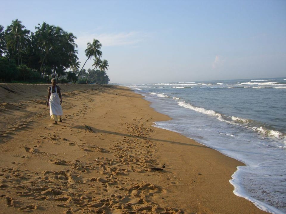 leichte Brandung, leicht aufgewühltes Wasser, teilweise mit Strömung. Die Gärtnerin reinigte ihn jeden morgen ab 06:00 Uhr vom Strandgut.