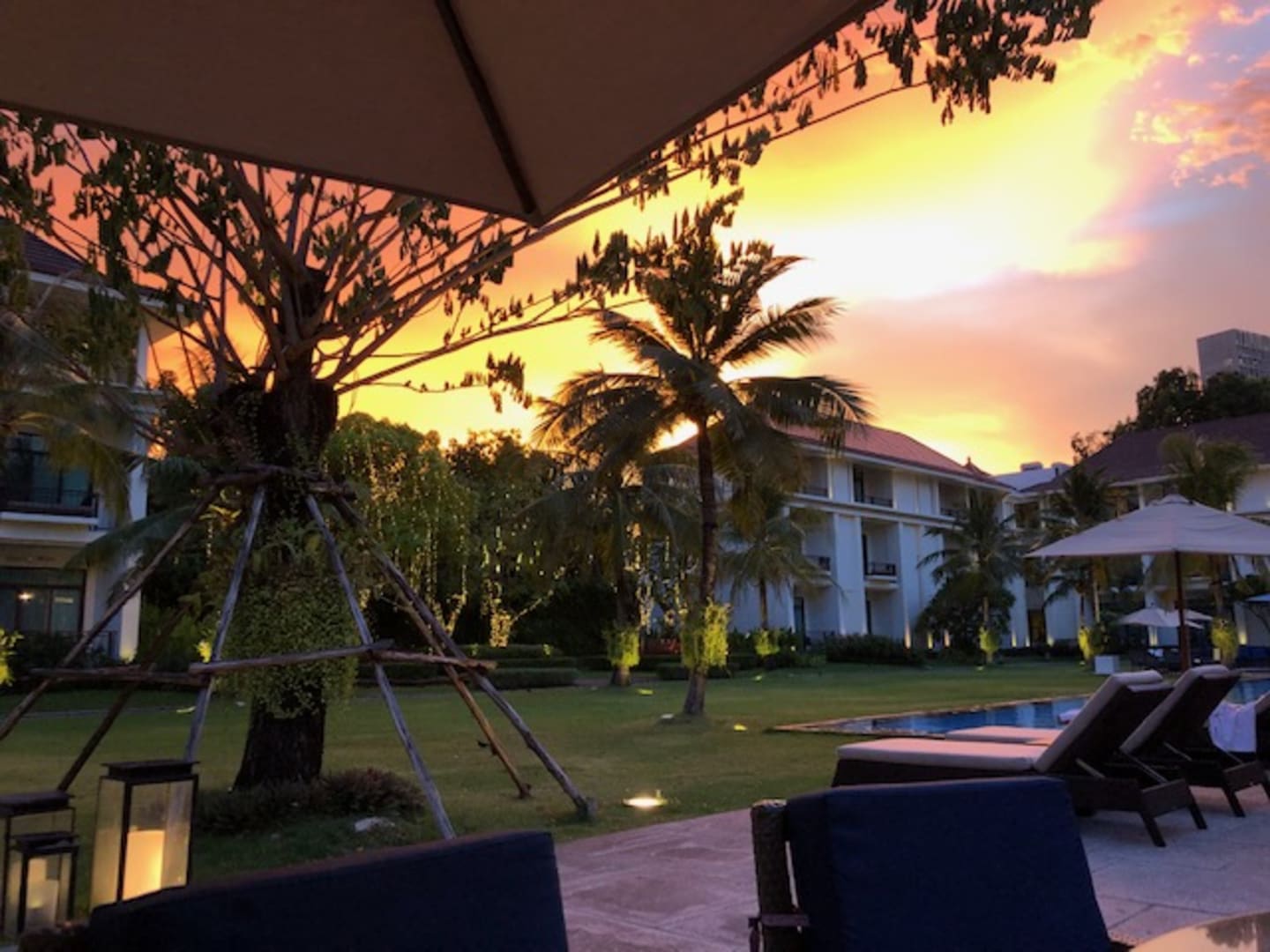 Pool und Garten am Abend.