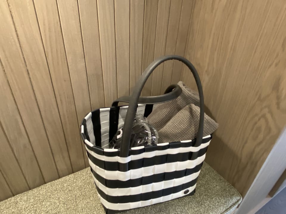Tasche mit Handtüchern, Hausschuhen, Bademantel