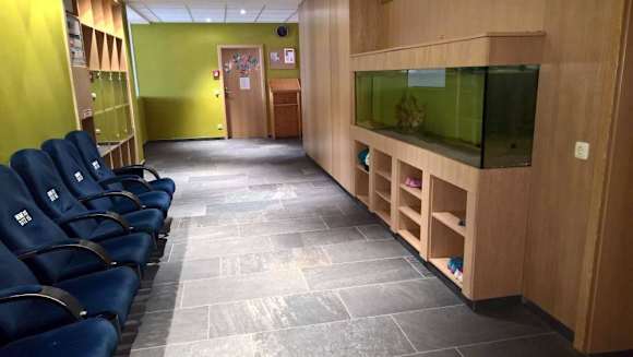 Zugang zum Kindergarten. Sperrholzmöbel, leeres Aquarium, ausrangierte Kinositze