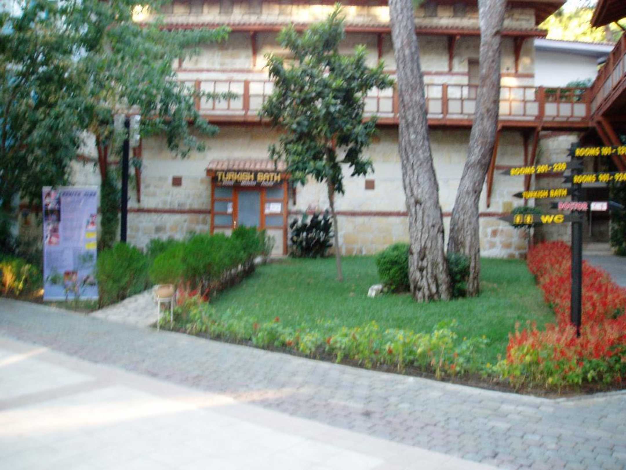 Türkische Riviera, Göynük bei Kemer: " Kemer Holiday Village" ; zu sehen: Teil des Pools, der am Nachmittag durch die Bäume im Schatten liegt, mit Blick auf das Restaurant (Frühstück+Mittag)