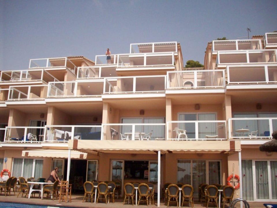 Ansicht von der Eingangstreppe zur Anlage des Ap.-Htl. Don Camilo in San Telmo auf die schönen geräumigen Balkone bzw. Terrassen der App., von wo aus man einen herrlichen Meerblick genießt.