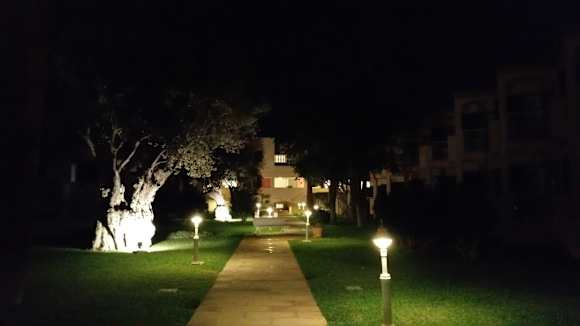Vom Pool aus zu den Zimmern bei Nacht
