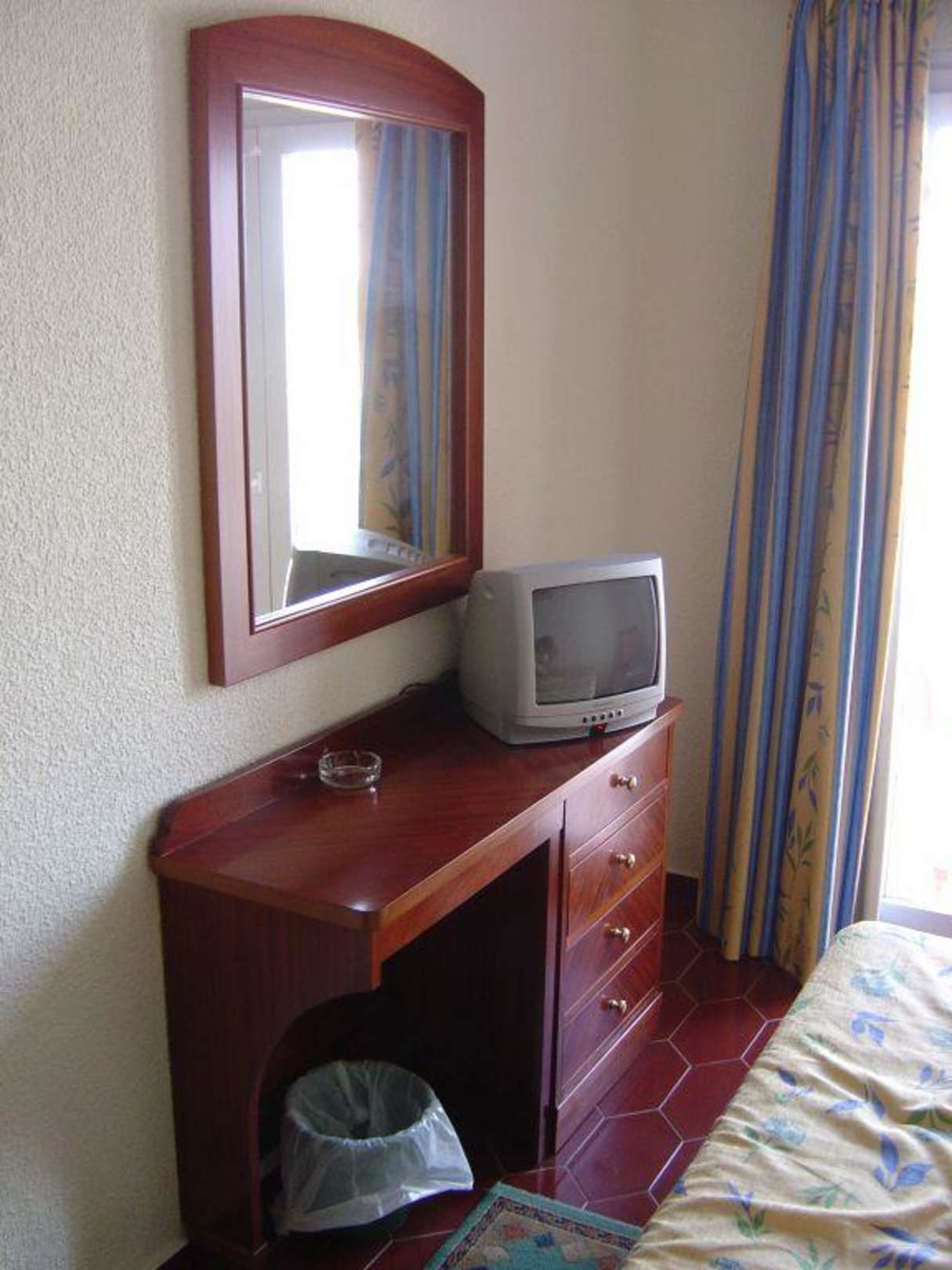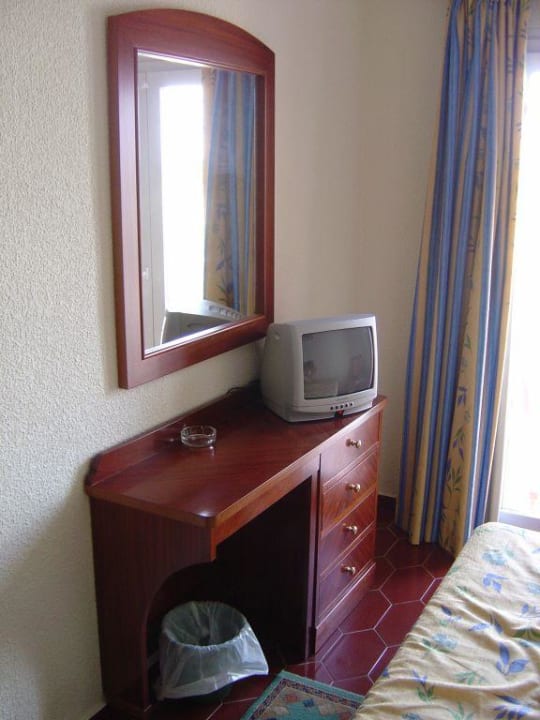 Der Schreibtisch mit Wandspiegel und Fernseher