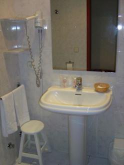 Waschbecken mit Spiegel und Haartrockner