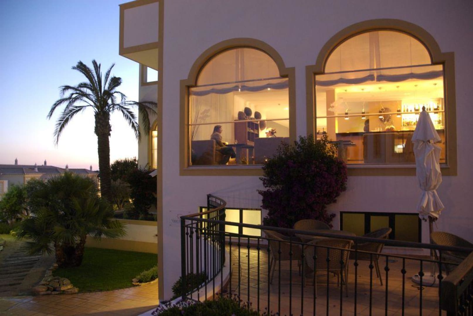 blick vom restaurant auf das Hotelgebäude mit bar