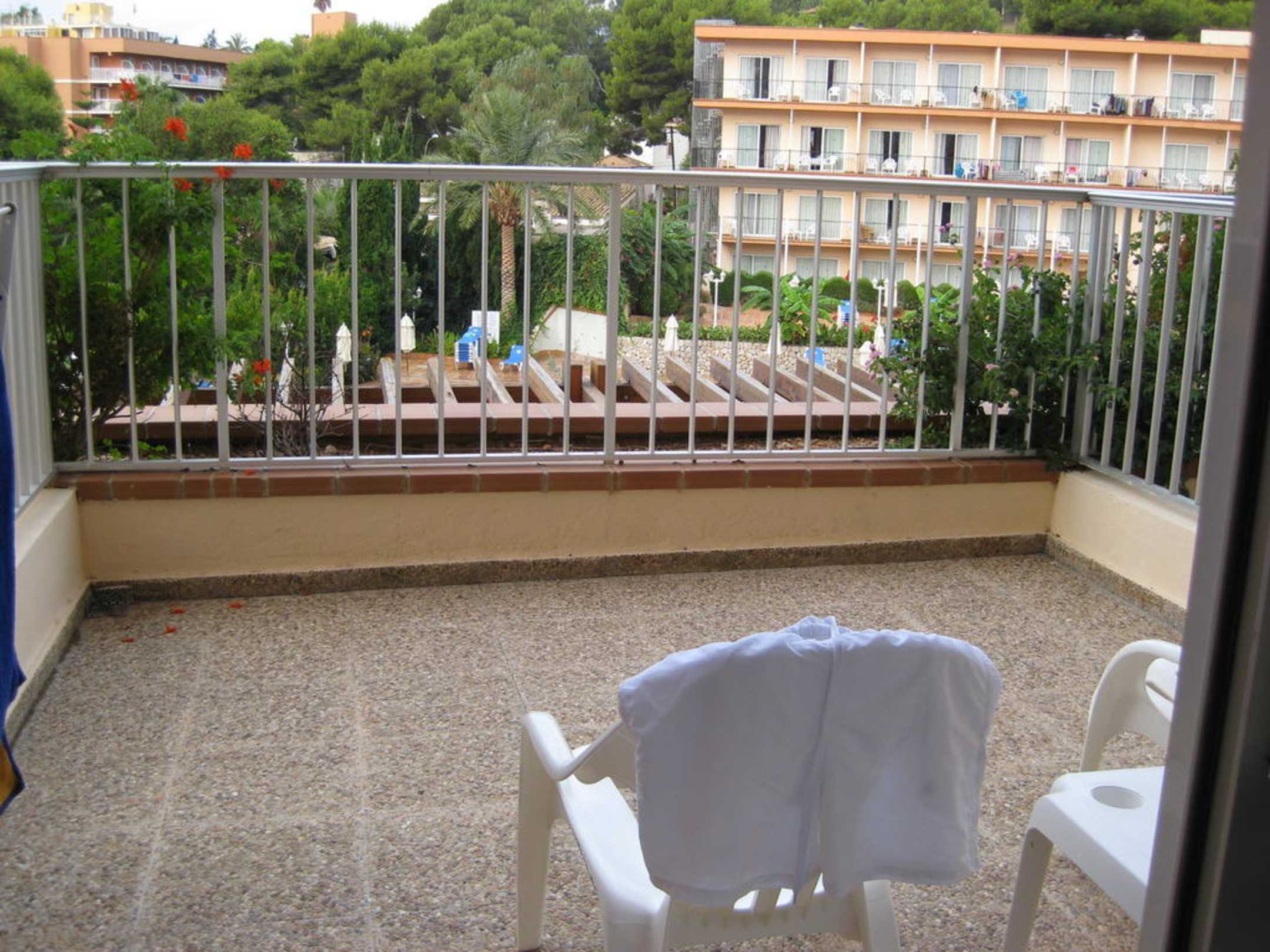 Unser großer Balkon im 1. Stock mit Blick auf den Pool