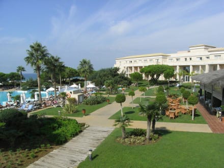 Das Bild zeigt einen Teil der weitläufigen Pool- und Gartenanlage.